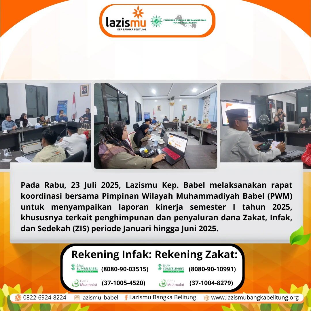 Sebagai bentuk transparansi dan akuntabilitas dalam mengelola dan umat Lazismu Kep. Bangka Belitung menyampaikan laporan keuangan periode Januari–Juli 2025 kepada Pimpinan Wilayah Muhammadiyah (PWM) Bangka Belitung.